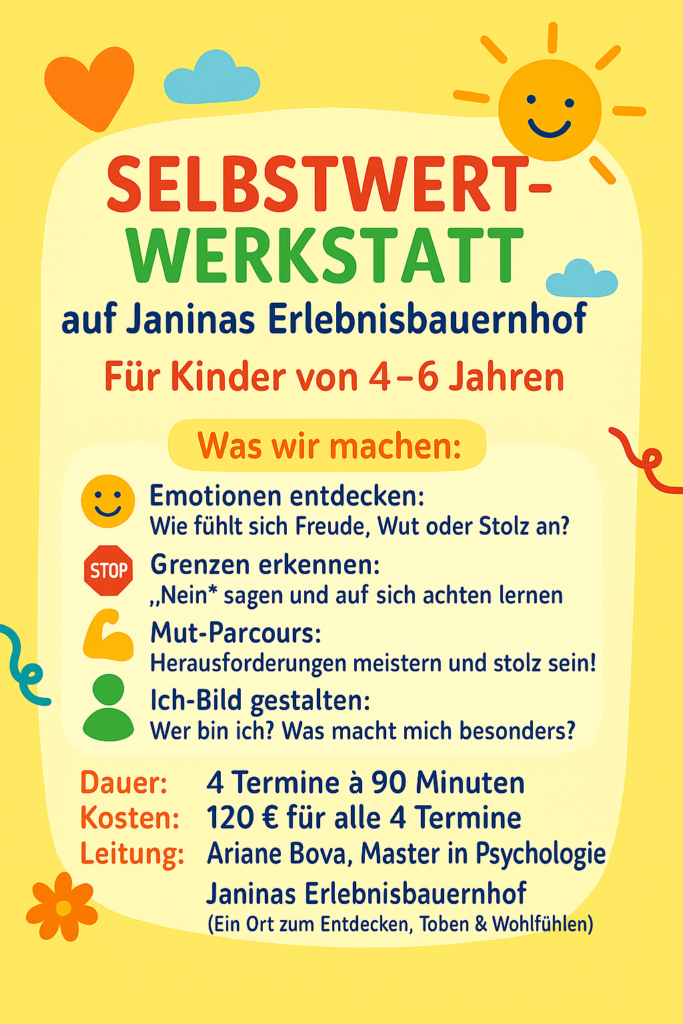 In der Selbstwert-Werkstatt entdecken Kinder spielerisch ihre innere Stärke. Mit Geschichten, Bewegung, Kreativität und Parcours lernen sie, sich selbst zu vertrauen, Gefühle wahrzunehmen und auszudrücken – ganz ohne Leistungsdruck.